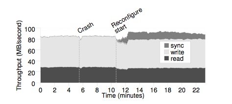 One of the irritations of conventional dual active/active RAID controllers is that failover can take a minute or more, possibly causing applications to time out, and just generally slowing things down. Since FAB is distributed, and any brick can service any client with any I/O, one would hope to see much less disruption when a FAB failure occurs. And one does.